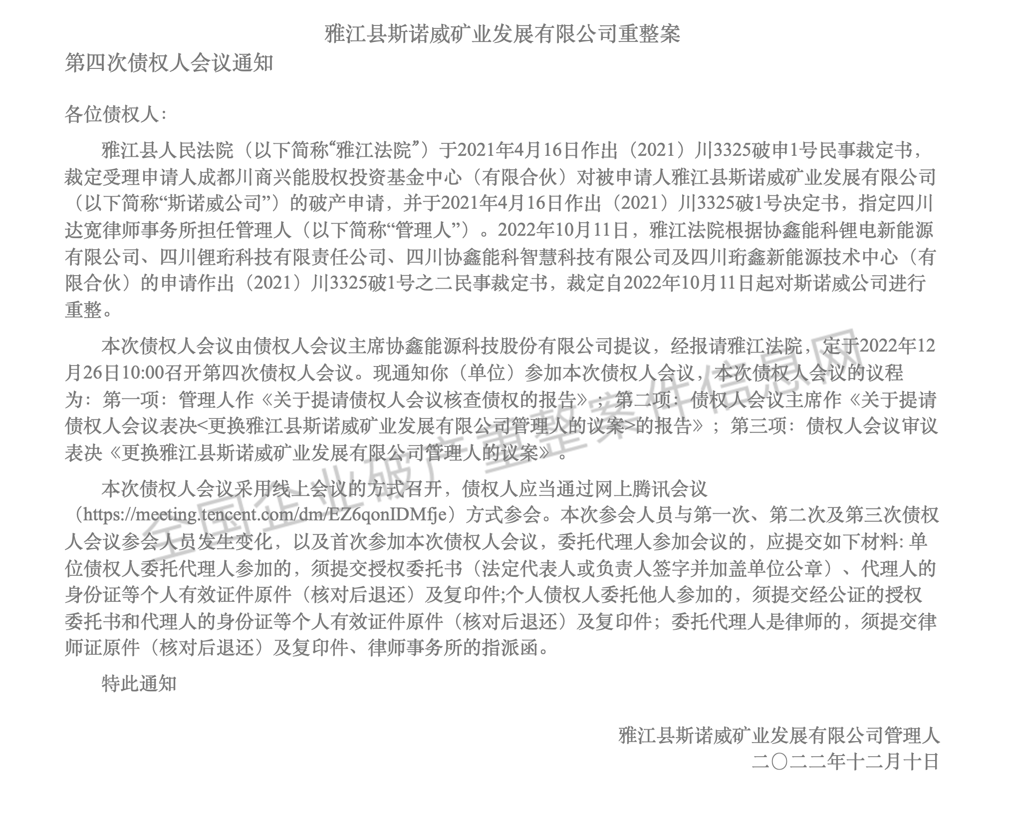 财联社12月16日电,财联社记者从全国企业破产重整案件信息网获悉,斯诺威公司定于12月26日10:00召开第四次债权人会议,该会议由债权人会议主席协鑫能科提议。其中,债权人会议主席作《关于提请债权人会议表决<更换雅江县斯诺威矿业发展有限公司管理人的议案>的报告》,并随后审议表决《更换雅江县斯诺威矿业发展有限公司管理人的议案》。小财注:斯诺威公司第一顺位重整投资人的为宁德时代,备选重整投资人为协鑫能科。原定于12月15日当日16:00开始进行的斯诺威公司54.2857%股权第十轮拍卖已中止,原因为斯诺威公司重整计划草案可能对本次拟拍卖的股权有重大影响。(财联社记者 曾楚楚 李子健)