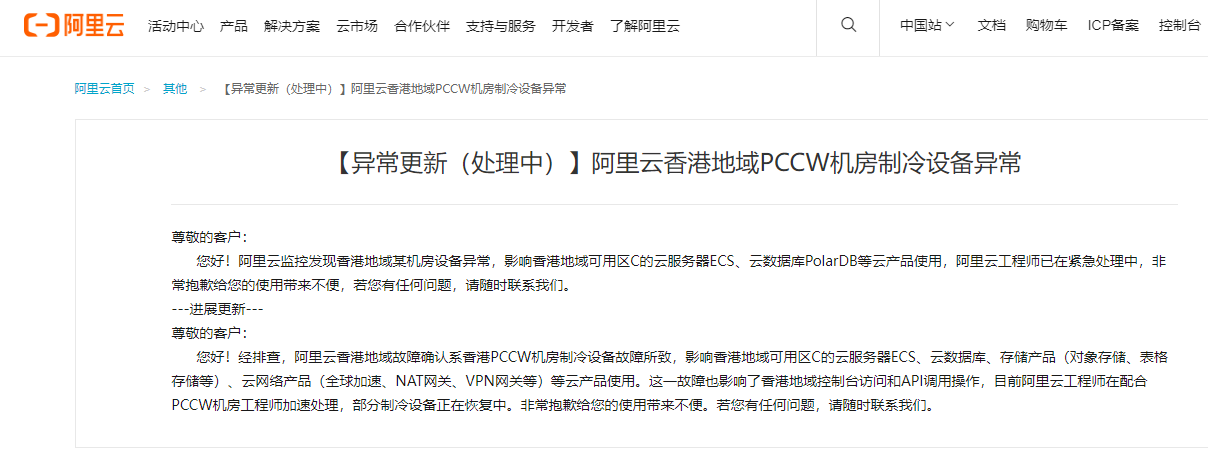 阿里云:香港地域故障确认系PCCW机房制冷设备故障所致