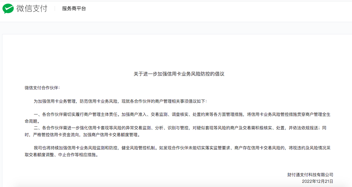 财联社12月21日电,微信支付21日发布《关于进一步加强信用卡业务风险防控的倡议》。倡议提到,各合作伙伴需进一步强化信用卡套现等风险的异常交易监测、分析、识别与管控,对疑似套现等风险的商户及交易需积极核实、处置,并依法依规报送;同时,严格管控信用卡资金流向,加强商户信用卡交易额度管理。