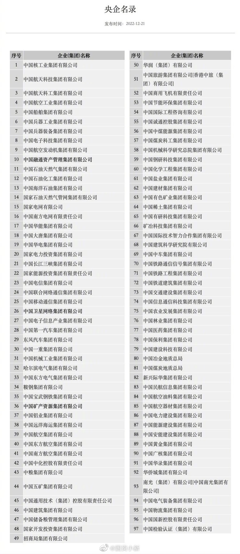 财联社12月21日电,中国宝武与中国中钢实施重组,中国中钢集团有限公司整体划入中国宝武钢铁集团有限公司后,中央企业调整为97家。名单如下。