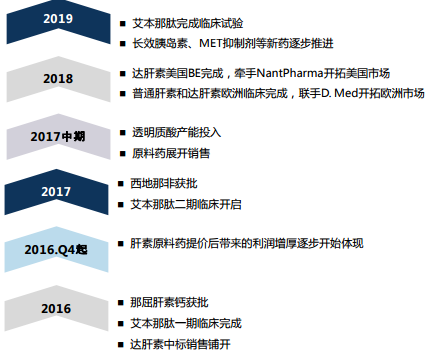 公司与美方合作的第一个创新药是艾本那肽,目前已开始着手艾本那肽的二期临床试验, 预计将在 20 家三级医院进行临床,并有望将二期和三期合并进行,一期临床数据中药物安全 性和代谢曲线表现良好。未来有望就长效胰岛素、白蛋白结合纳米粒肿瘤血管破坏剂、Met 抑制剂等药物进行研发。 预计艾本那肽有望在 2019 年完成临床试验并申报上市,将成为公司的首个创新药品种。