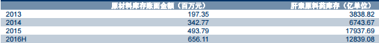 根据公司 2016 年中报数据披露,公司原材料库存约 6.56 亿元,我们预计这其中大部分 为肝素粗品,且采购时间均在行业低谷期间。公司 2016 年中报中明确披露:肝素钠原料药生 产量同比增长 47.80%、库存量同比增长 165.99%,为应对市场变化储存相应增加所致。