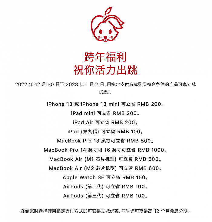 财联社12月27日电,据苹果中国官网显示,苹果公司开启了新一轮的“立减活动”,2022年12月30日至2023年1月2日用指定支付方式购买符合条件的产品可享立减优惠,不同产品降价100元-1000元。