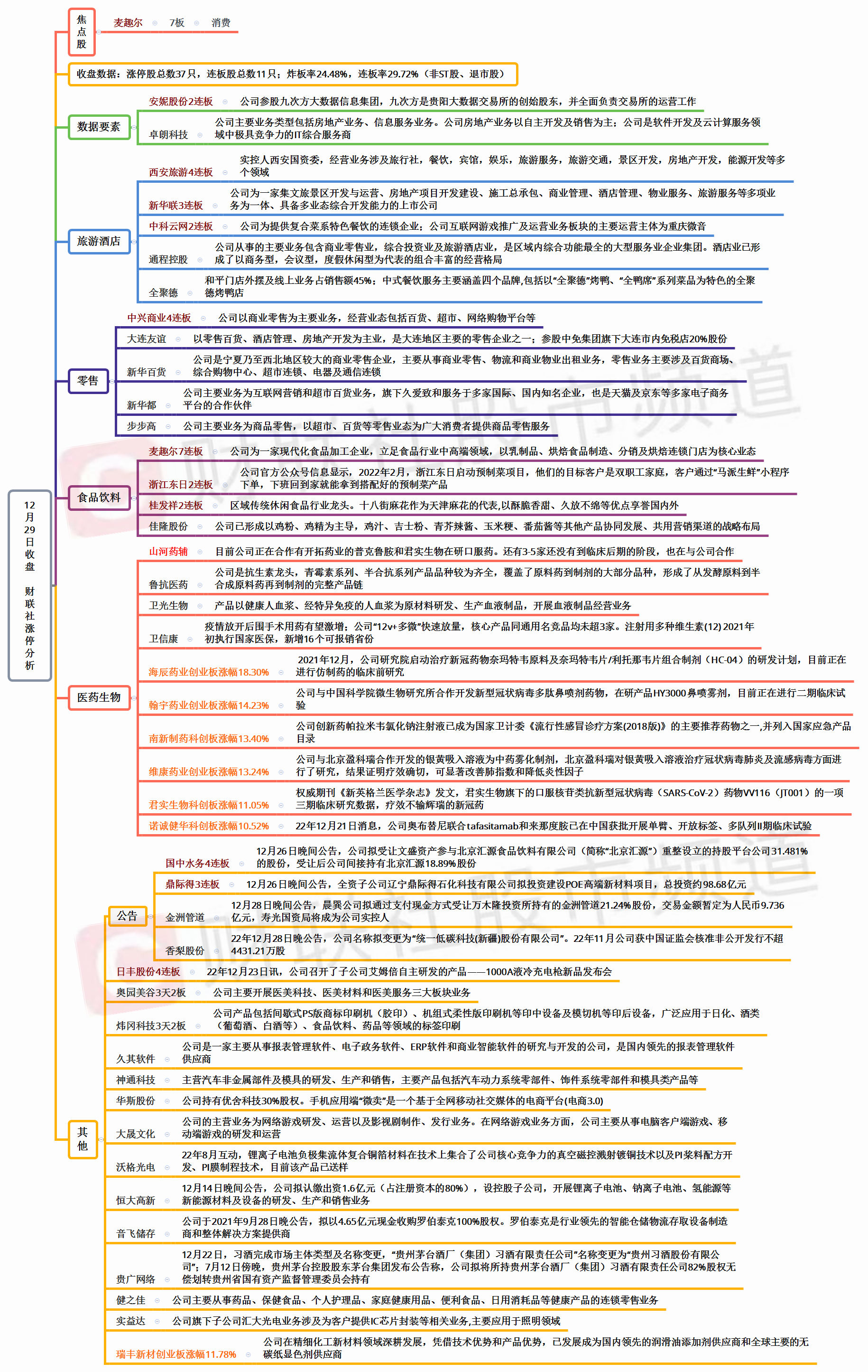 今日共37股涨停,连板股总数11只,12股封板未遂,封板率为75%(不含ST股、退市股及未开板新股)。个股方面,食品饮料板块麦趣尔7板、国中水务4板、桂发祥2板,旅游股西安旅游4板、新华联3板、中科云网2板,零售板块中兴商业4板,充电桩概念股日丰股份4板,POE胶膜概念股鼎际得3板,数据要素板块安妮股份2板,次新股炜冈科技3天2板。今日收涨个股1540只,收跌个股3226只。