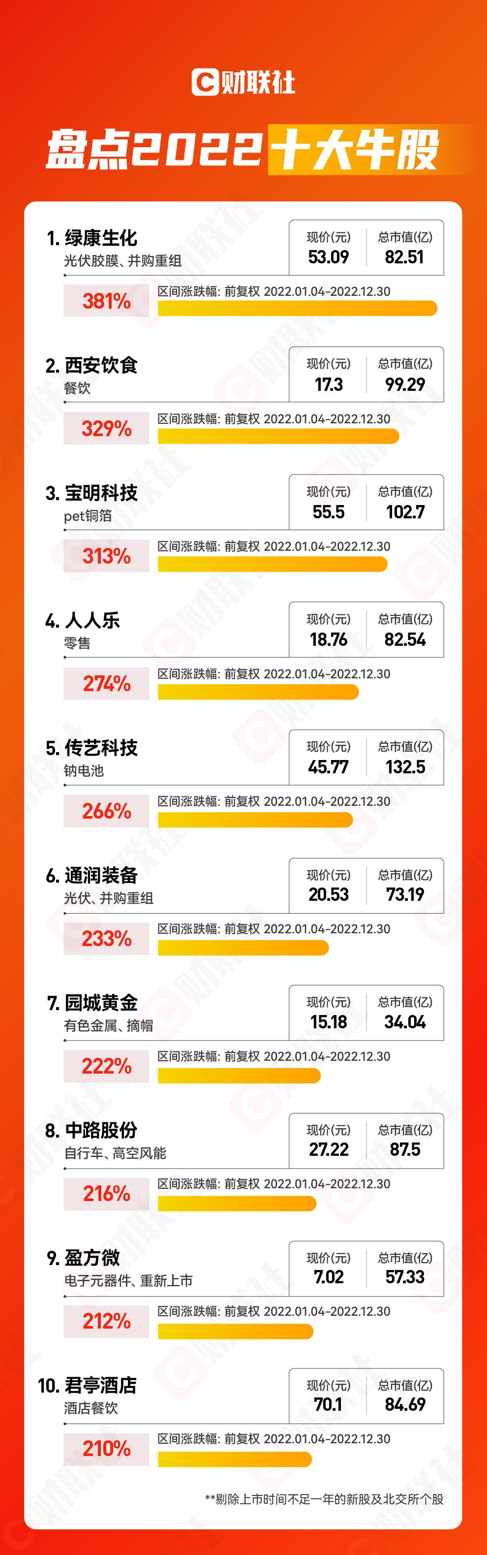 2022年十大牛股新鲜出炉:绿康生化涨近4倍夺股王 赛道股占据半壁江山