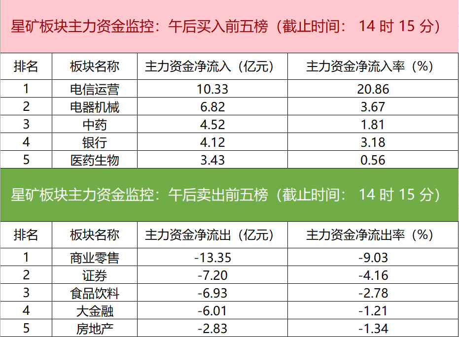 财联社1月3日电,财联社星矿数据显示,今日主力资金净流入电信运营、电器机械、中药等板块,净流出商业零售、证券、食品饮料等板块,其中商业零售板块净流出13.35亿。个股方面,中国联通涨停,主力资金净买入9.06亿元,众生药业、南天信息、人民网等获主力资金净流入居前;爱美客遭净卖出超2亿,跨境通、五粮液、亿纬锂能等主力资金净流出额居前。