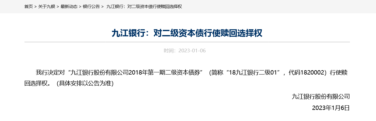 反转!九江银行正式公告:对二级资本债行使赎回选择权