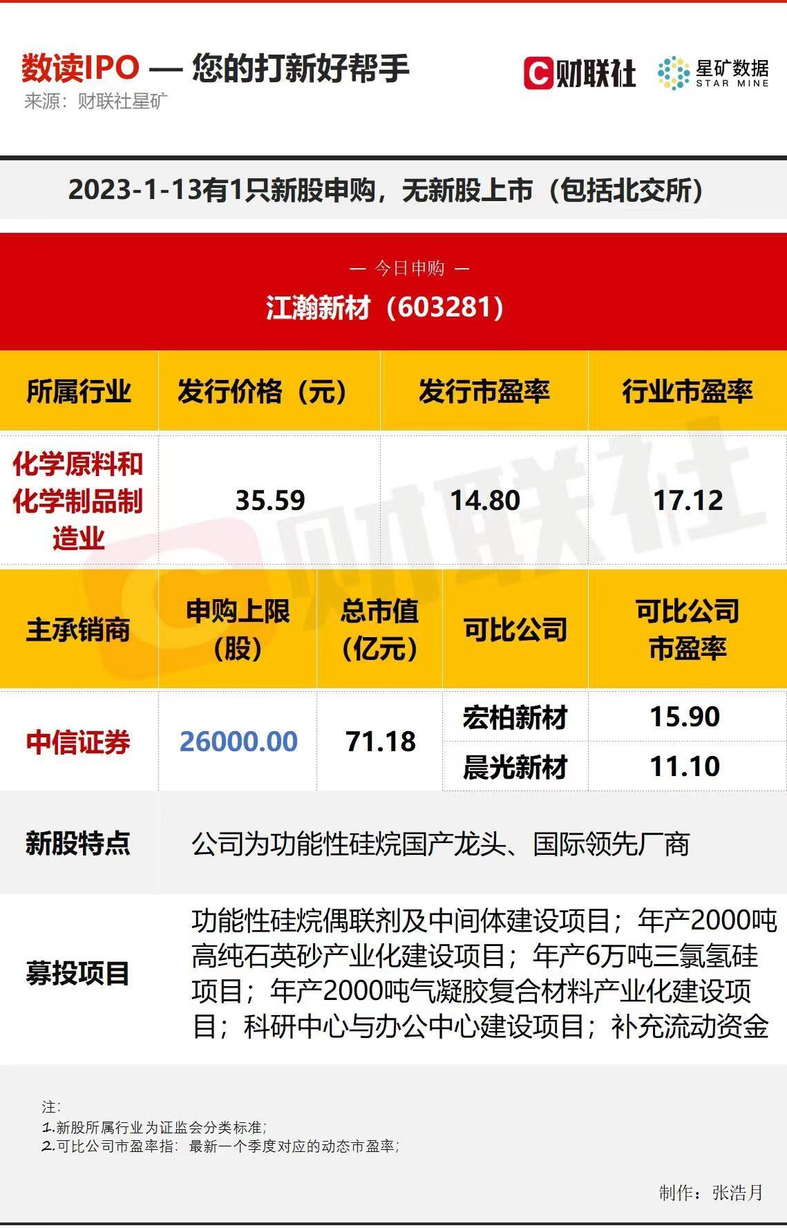 财联社1月13日电,今日1只新股申购,为沪市主板的江瀚新材;无新股上市。江瀚新材是功能性硅烷国产龙头。