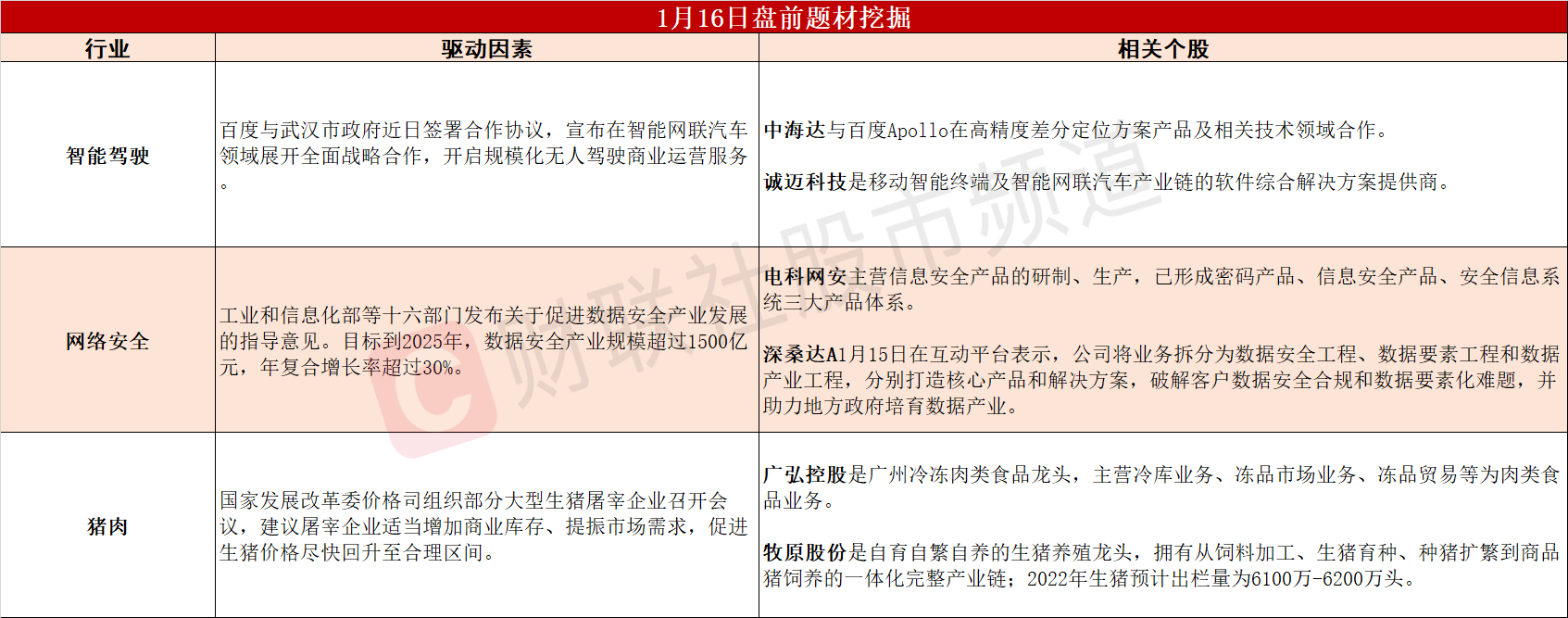 ①武汉全域或将开放无人驾驶,智能化将开启汽车新一轮增长曲线;②十六部门发布数据安全产业顶层文件,产业规模将超过1500亿元;③发改委建议屠宰企业适当增加库存,猪价有望回升至合理区间。