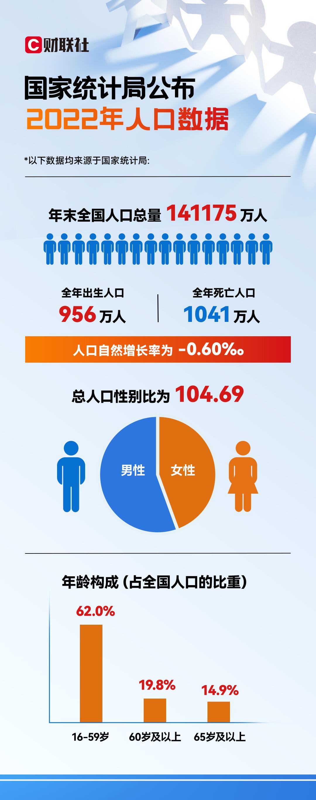 财联社1月17日电,国家统计局17日发布2022年全年经济数据。数据显示,2022年末人口总量有所减少;人口自然增长率为-0.60‰;男性人口 72206万人,女性人口68969万人,总人口性别比为104.69(以女性为100)。