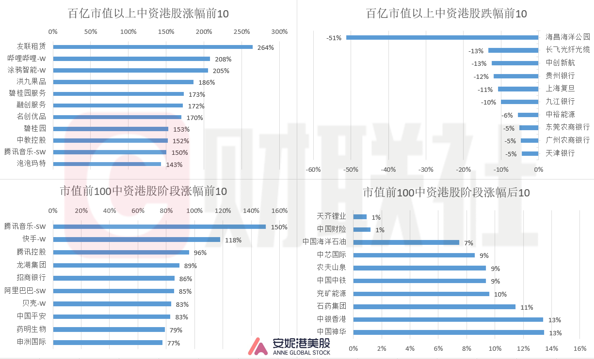 财联社1月17日电,自港股恒指2022年10月31日触底反弹,截至2023年1月17日收盘,按前复权股价计(剔除反弹后上市新股):总市值百亿港元以上的中资股里,友联租赁、哔哩哔哩和涂鸦智能涨幅居前,累计涨幅均超2倍。总市值前100的中资股里,腾讯音乐、快手和腾讯控股涨幅排前3,累计涨幅接近或超1倍。