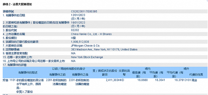 万科企业:获摩根大通增持241.14万股公司股份 持仓比例上升至6.09%