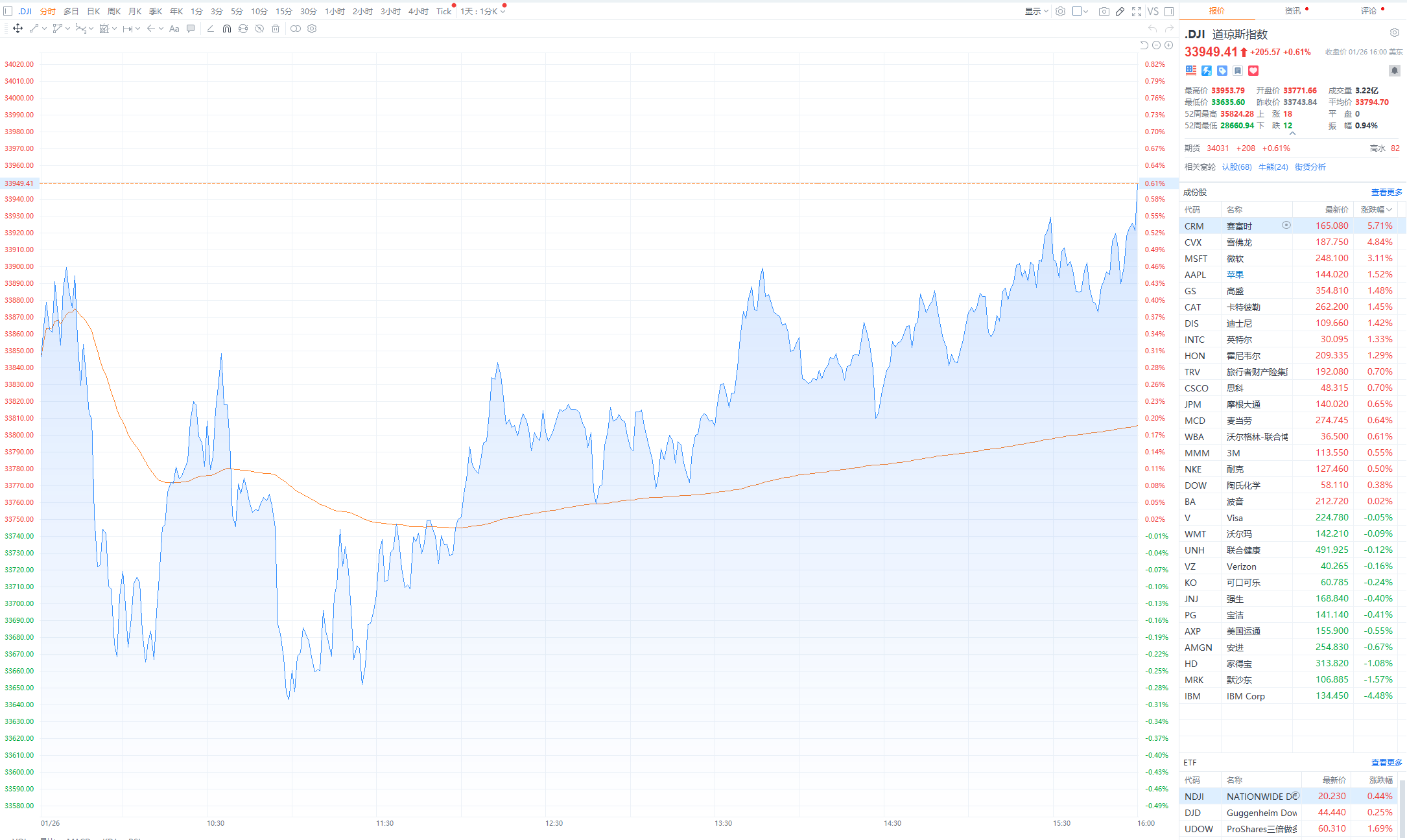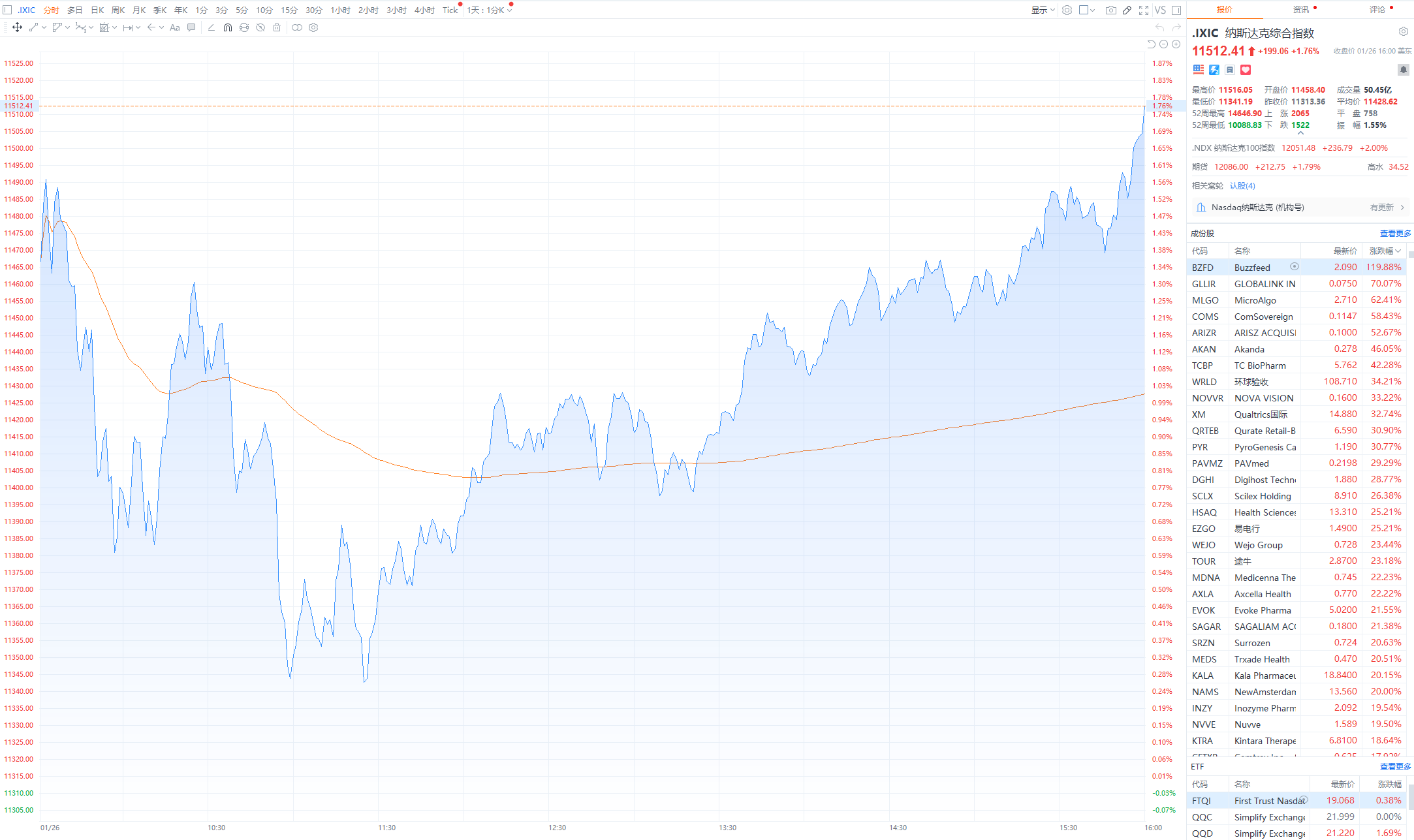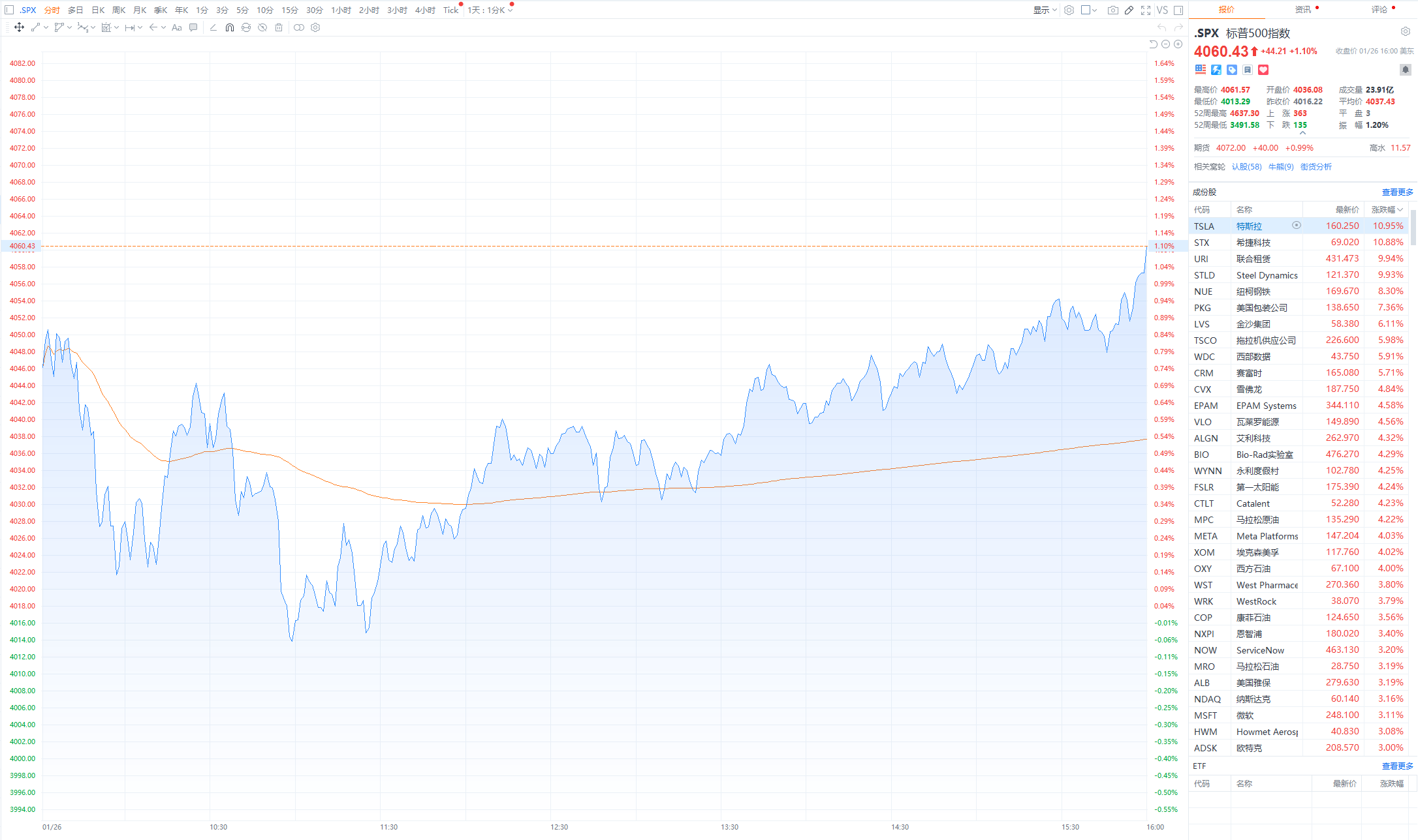 财联社1月27日电,美股三大指数集体收涨,纳指涨1.76%,标普500指数涨1.1%,道指涨0.61%。特斯拉涨约11%,市值重回5000亿美元上方。大型科技股多数上涨,脸书涨超4%,微软涨约3%,谷歌、亚马逊涨超2%,苹果涨超1%;奈飞小幅下跌。能源股表现强势,雪佛龙涨超4%,埃克森美孚、康菲石油、西方石油涨超3%,斯伦贝谢涨超2%。