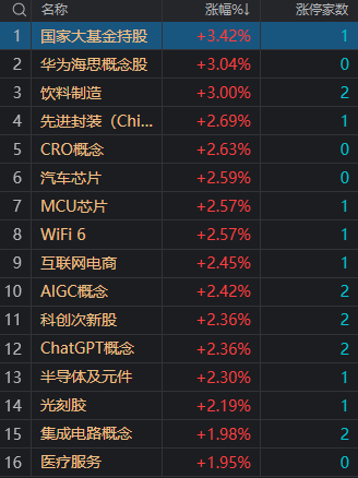 财联社2月2日电,市场早盘探底回升,三大指数均小幅上涨。盘面上,芯片概念股集体走强,华力创通20CM涨停,同兴达涨停,龙芯中科、寒武纪涨超10%。消费股盘中活跃,香飘飘、中葡股份、味知香涨停。医药股展开反弹,CRO方向领涨,泓博医药、新天地涨超5%。ChatGPT概念股继续强势,初灵信息2连板,汉王科技4连板。下跌方面,券商等金融板块高开低走,弘业期货接近跌停。总体上个股涨多跌少,两市超2700只个股上涨。沪深两市今日成交额6379亿,较上个交易日放量628亿。板块方面,饮料制造、大基金持股、CRO、ChatGPT概念等板块涨幅居前,教育、保险、大飞机、托育服务等板块跌幅居前。截至上午收盘,沪指涨0.29%,深成指涨0.37%,创业板指涨0.32%。北向资金方面,沪股通早盘净流入11.46亿,深股通早盘净流入12.28亿。