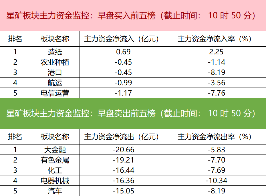 财联社2月3日电,财联社星矿数据显示,今日早盘主力资金仅净流入造纸板块,净流出大金融、有色金属、化工等板块,其中净流出大金融板块超20亿元。个股方面,江瀚新材大涨,主力资金净买入5.99亿元,福石控股、成飞集成、安妮股份获主力资金净流入居前;中国平安遭净卖出超5亿元,中天科技、长安汽车、隆基绿能主力资金净流出额居前。