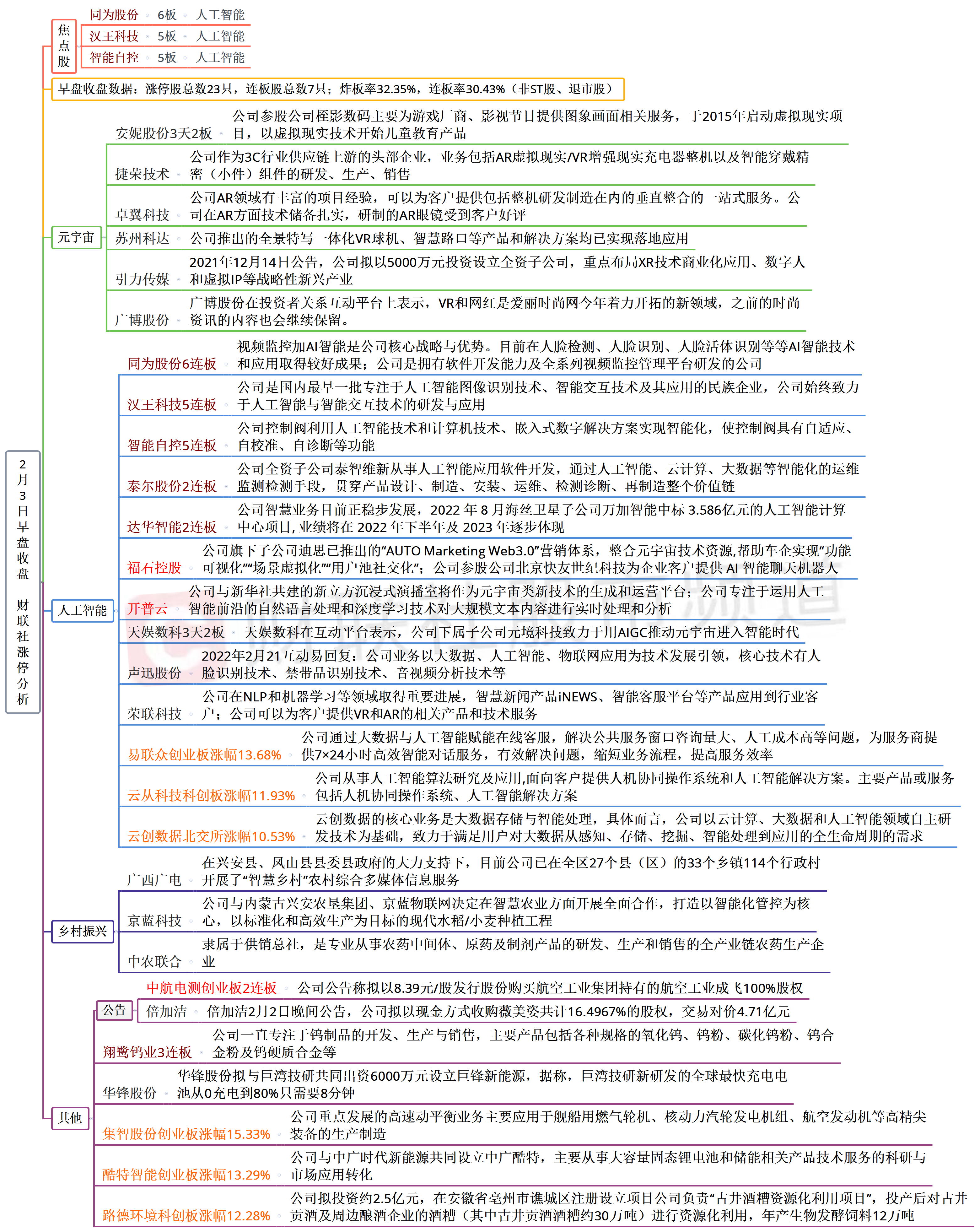 今日午盘两市共23股涨停,连板股总数7只,11股封板未遂,封板率为67%(不含ST股、退市股及未开板新股)。个股方面,人工智能概念股同为股份6板、智能自控5板、汉王科技5板,小金属板块翔鹭钨业3板,资产重组的中航电测创业板2板。