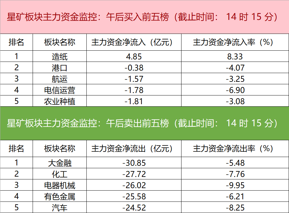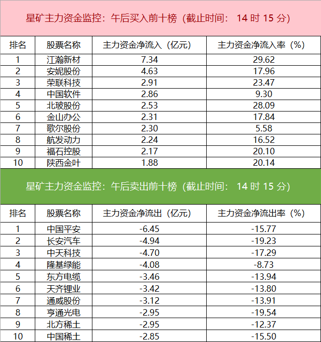 财联社2月3日电,财联社星矿数据显示,今日主力资金仅净流入造纸板块,净流出大金融、化工、电器机械等板块,其中大金融板块净流出30.85亿。个股方面,江瀚新材大涨,主力资金净买入7.34亿元,安妮股份、荣联科技、中国软件等获主力资金净流入居前;中国平安遭净卖出超6亿,长安汽车、中天科技、隆基绿能等主力资金净流出额居前。