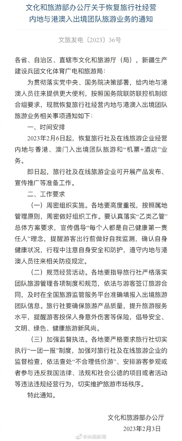 文旅部:恢复旅行社经营内地与港澳入出境团队旅游业务