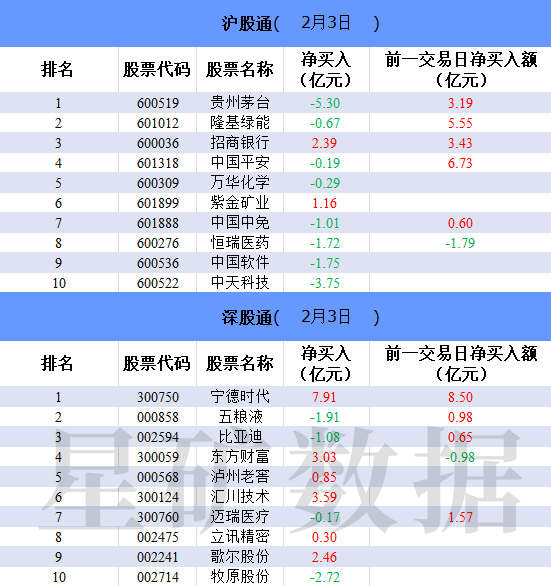 财联社2月3日电,北向资金今日净卖出42.46亿元。贵州茅台、中天科技、牧原股份分别净卖出5.30亿元、3.75亿元、2.72亿元。宁德时代净买入额居首,金额为7.91亿元。