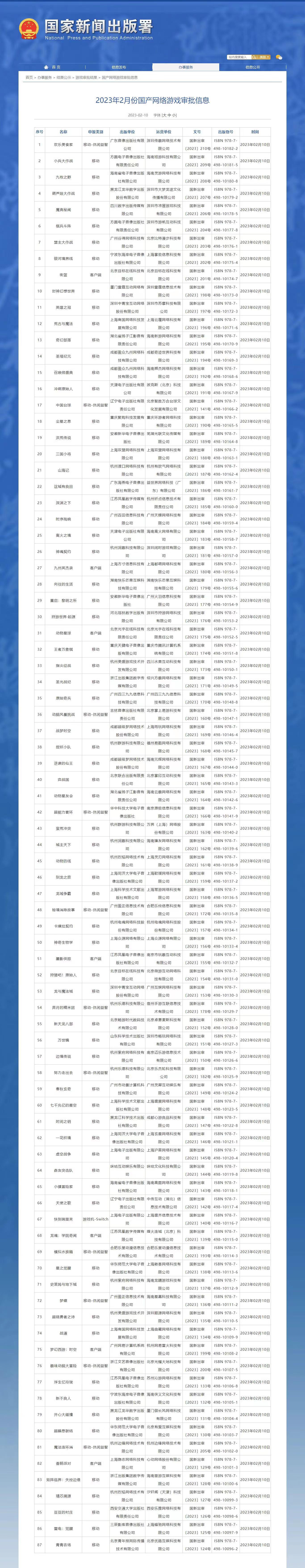 财联社2月10日电,国家新闻出版署发布2023年2月份国产网络游戏审批信息,共87款游戏获批。网易旗下的《梦幻西游:时空》以及腾讯子公司旗下的《王者万象棋》在列。
