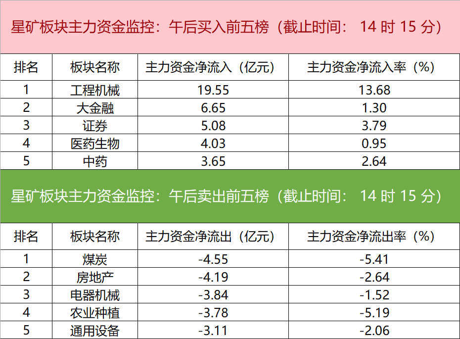 财联社2月13日电,财联社星矿数据显示,今日主力资金净流入工程机械、大金融、证券等板块,净流出煤炭、房地产、电器机械等板块,其中工程机械板块净流入19.55亿。个股方面,三一重工大涨,主力资金净买入12.66亿元,贵州茅台、浪潮信息、泸州老窖等获主力资金净流入居前;紫光国微遭净卖出超3亿,兴业银行、南威软件、杉杉股份等主力资金净流出额居前。