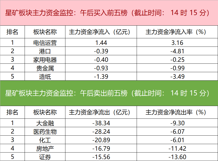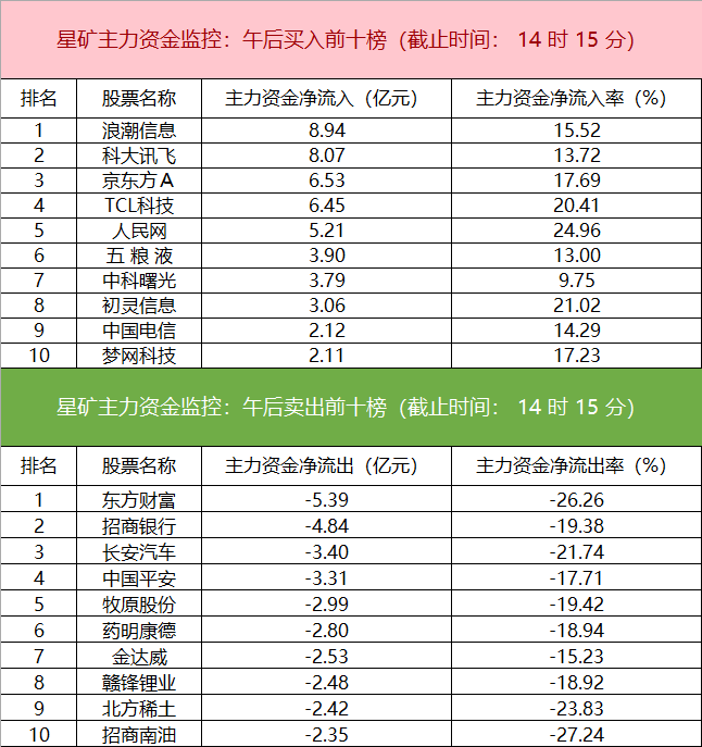 财联社2月15日电,财联社星矿数据显示,今日主力资金仅净流入电信运营板块,净流出大金融、医药生物、化工等板块,其中大金融板块净流出38.34亿。个股方面,浪潮信息涨停,主力资金净买入8.94亿元,科大讯飞、京东方A、TCL科技等获主力资金净流入居前;东方财富遭净卖出超5亿,招商银行、长安汽车、中国平安等主力资金净流出额居前。