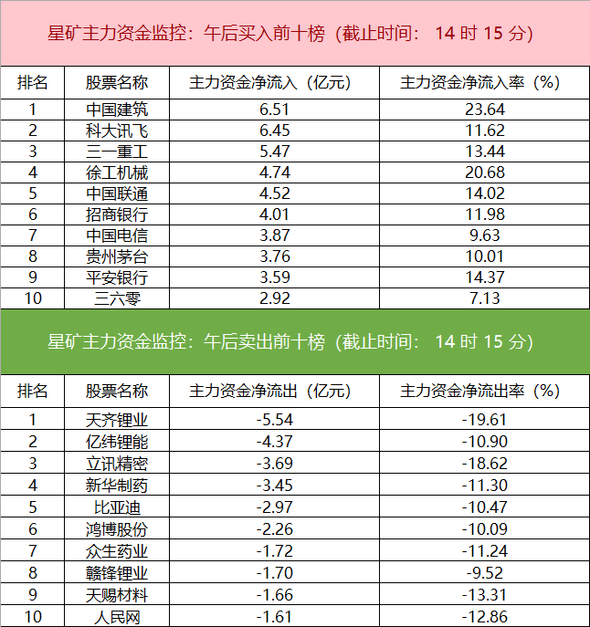 财联社2月20日电,财联社星矿数据显示,今日主力资金净流入大金融、证券、银行等板块,净流出医药生物、中药、化工等板块,其中大金融板块净流入44.77亿。个股方面,中国建筑大涨,主力资金净买入6.51亿元,科大讯飞、三一重工、徐工机械等获主力资金净流入居前;天齐锂业遭净卖出超5亿,亿纬锂能、立讯精密、新华制药等主力资金净流出额居前。