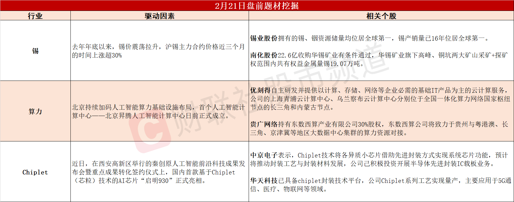 ①全球储量已大幅下滑超50%,新能源打开锡产业成长空间;②北京首个人工智能计算中心正式落地,算力扩容蓄势待发;③国内首款基于Chiplet AI芯片亮相,算力需求推动Chiplet市场空间激增。