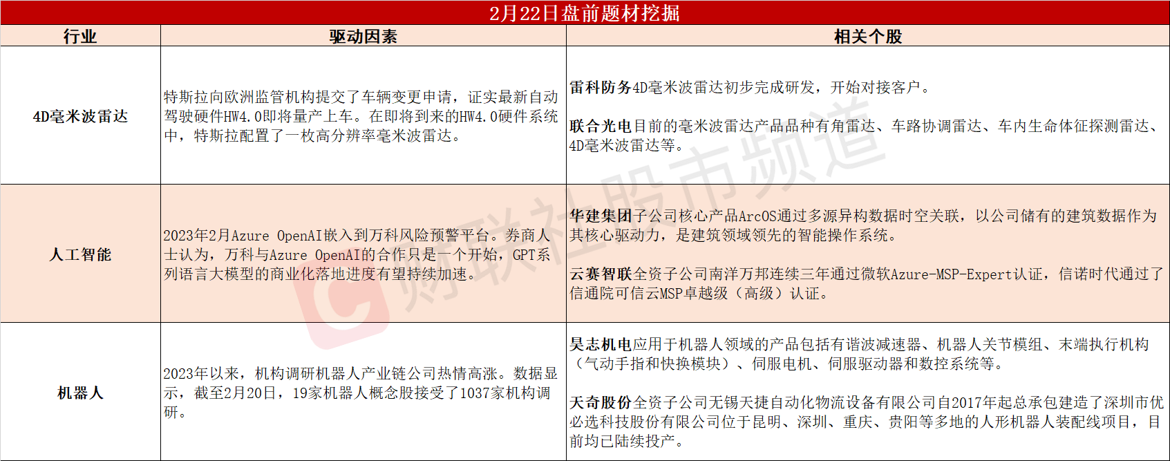 ①特斯拉将搭载4D毫米波雷达,美股Arbe昨夜一度暴涨70%;②万科与Azure OpenAI合作落地,GPT系列商业化有望持续加速;③机构密集调研机器人产业链公司,ChatGPT或带来行业下一拐点。