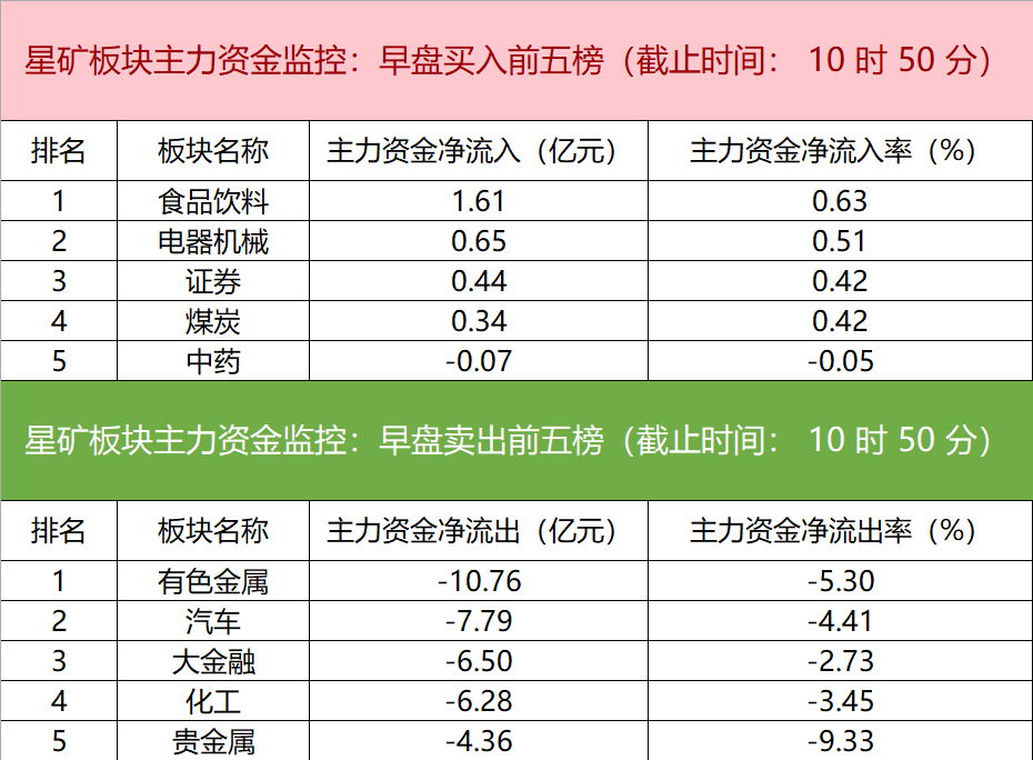 财联社2月22日电,财联社星矿数据显示,今日早盘主力资金净流入食品饮料、电器机械、证券等板块,净流出有色金属、汽车、大金融等板块,其中净流出有色金属板块超10亿元。个股方面,首航高科涨停,主力资金净买入3.18亿元,拓尔思、云赛智联、积成电子获主力资金净流入居前;中国电信遭净卖出超4亿元,恒宝股份、汤姆猫、比亚迪主力资金净流出额居前。