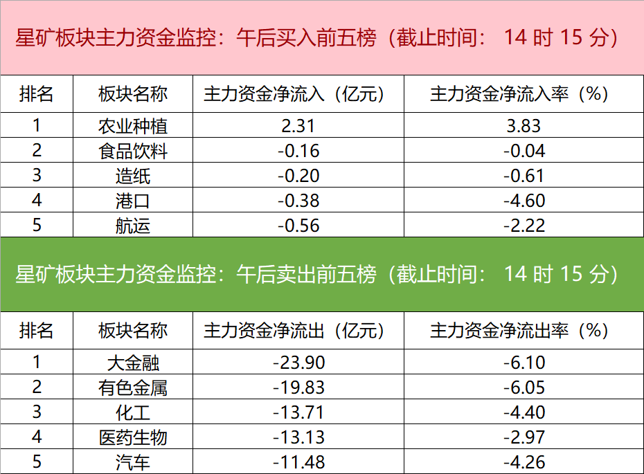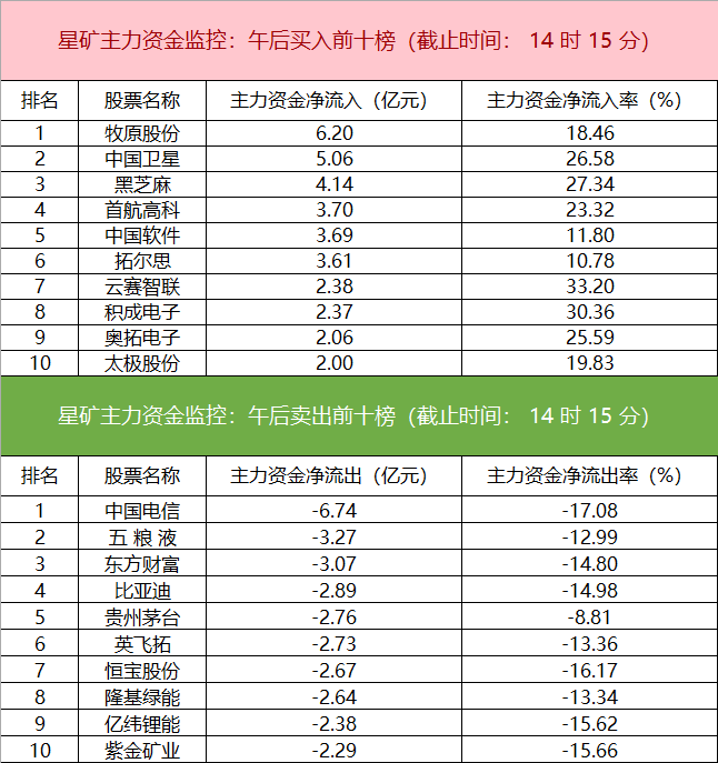 财联社2月22日电,财联社星矿数据显示,今日主力资金仅净流入农业种植板块,净流出大金融、有色金属、化工等板块,其中大金融板块净流出23.90亿。个股方面,牧原股份上涨,主力资金净买入6.20亿元,中国卫星、黑芝麻、首航高科等获主力资金净流入居前;中国电信遭净卖出超6亿,五粮液、东方财富、比亚迪等主力资金净流出额居前。