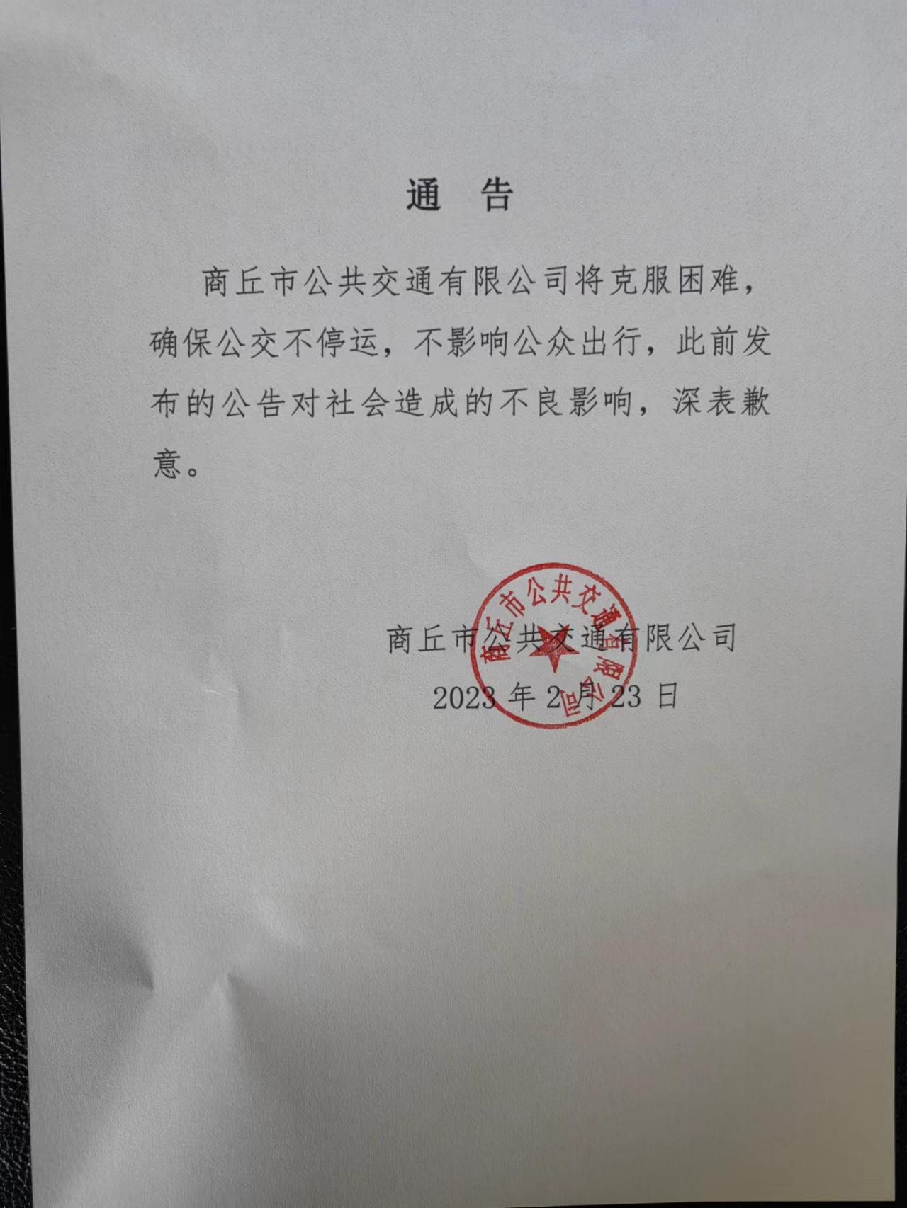 财联社2月23日电,商丘市公交公司发布最新通告,内容如下:商丘市公共交通有限公司将克服困难,确保公交不停运,不影响公众出行,此前发布的公告对社会造成的不良影响,深表歉意。 (顶端新闻)