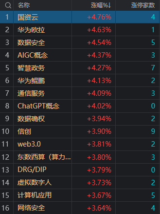 财联社3月1日电,市场早盘低开后震荡反弹,三大指数均小幅上涨,沪指再度站上3300点。盘面上,数字经济相关板块集体爆发,概念股掀涨停潮,国资云方向中国联通、浪潮信息、深桑达A涨停,ChatGPT方向海天瑞声涨超10%逼近前期高点,信创方向当虹科技、熙菱信息均20CM涨停。券商股盘中走强,哈投股份涨停。基建股震荡反弹,中衡设计涨停,中国电建涨超6%。下跌方面,眼科概念股集体调整,兴齐眼药跌超10%。总体上个股涨多跌少,两市超2900只个股上涨。沪深两市今日成交额5451亿,较上个交易日放量999亿。板块方面,国资云、通信服务、ChatGPT、信创等板块涨幅居前,纺织服装、眼科医疗、TOPCON电池、HJT电池等板块跌幅居前。截至上午收盘,沪指涨0.9%,深成指涨1.02%,创业板指涨0.57%。北向资金方面,沪股通早盘净流入34.1亿,深股通早盘净流入28.49亿。