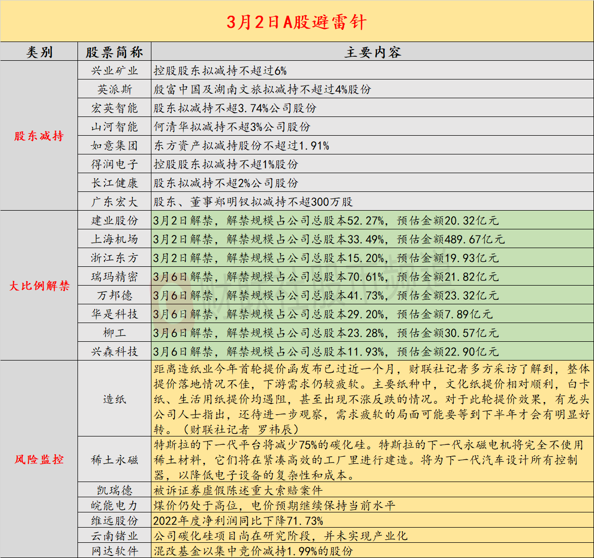 昨日A股拟减持规模较之前有所增多,兴业矿业控股股东拟减持不超过6%,英派斯股东殷富中国及湖南文旅拟减持不超过4%股份;上海机场、建业股份将迎来超三成以上解禁;造纸业年内首轮提价落地情况不佳,需求拐点恐延迟到下半年;凯瑞德被诉证券虚假陈述重大索赔案件;内蒙古安全大检查趋严,焦煤矿停产比例进一步扩大;皖能电力称煤价仍处于高位,但电价预期继续保持当前水平;美股三大指数收盘涨跌不一,诺瓦瓦克斯医药大跌超26%。