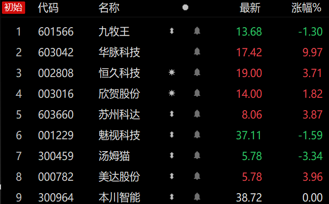 财联社3月3日电,市场焦点股九牧王(5板)低开1.30%,数据中心+光通信的华脉科技(4板)竞价涨停,燃料电池+数字经济的恒久科技(3板)高开3.71%,纺织股欣贺股份(4天3板)高开1.82%,人工智能板块苏州科达(2板)高开3.82%、魅视科技(2板)低开1.59%、汤姆猫(创业板首板)低开3.34%,实控人变更的美达股份(2板)高开3.96%,6G概念股本川智能(创业板首板)平开。