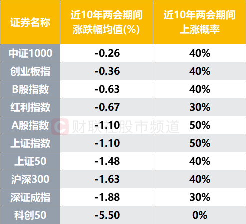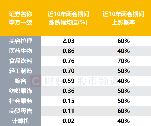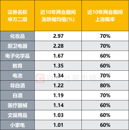财联社3月3日电,从近10年(2013年至2022年)数据上看,受两会前预期兑现、部分年份政策力度未超预期等因素影响,市场主要指数在两会期间基本呈现震荡或调整态势,其中,上证指数在两会期间涨跌概率各半,涨跌幅均值录得-1.1%。分板块统计,31个申万一级行业中,9个板块近十年区间涨幅均值录得正值,其中,美容护理平均上涨近2%,远超其他行业。虽然各板块在两会期间跌多涨少,但从细分板块来看,仍有不少方向维持高胜率。以申万二级统计,化妆品、厨卫电器、电子化学品、教育、电池、非白酒、白酒、医疗器械、文娱用品、小家电十个板块不仅上涨概率超50%,且均录得超1%的均值涨幅。(财联社 梓隆)