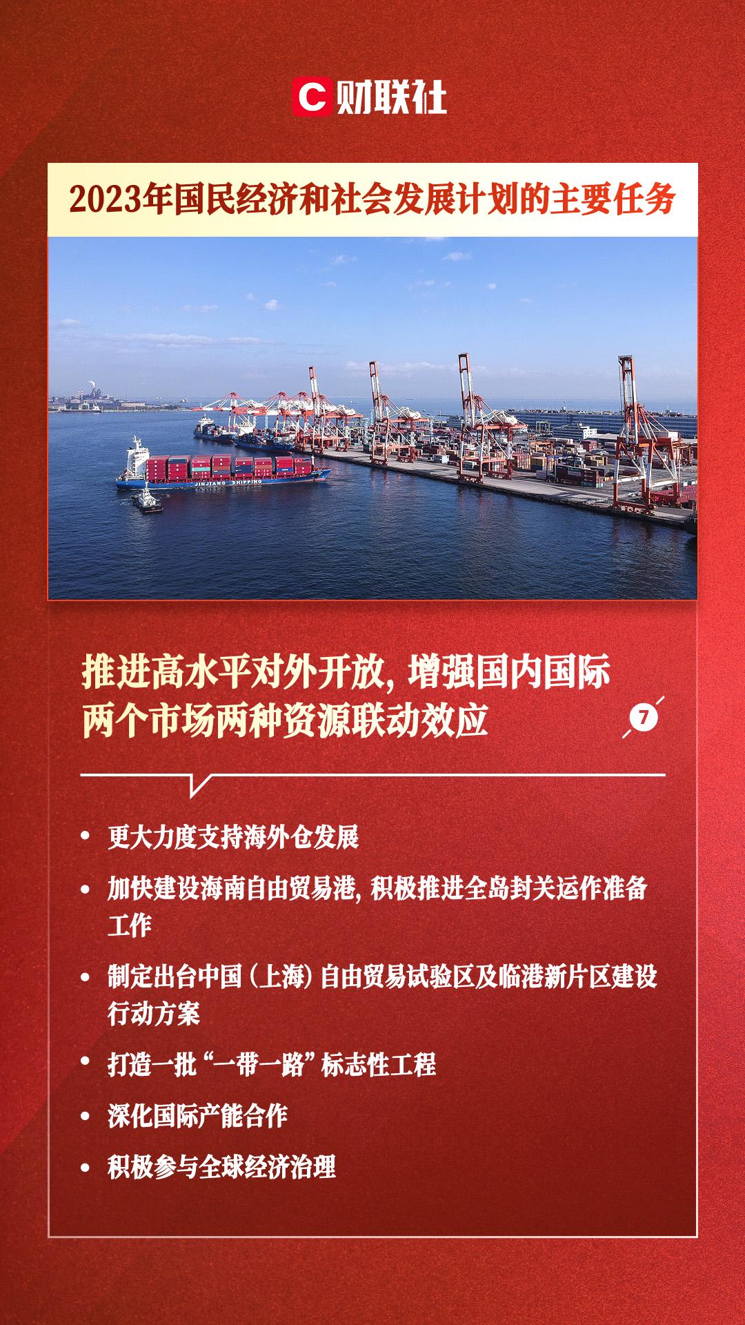 财联社3月5日电,2023年国民经济和社会发展计划草案指出,推进高水平对外开放,增强国内国际两个市场两种资源联动效应。一是加快推进贸易强国建设。大力发展跨境电商、市场采购贸易方式等新业态新模式,更大力度支持海外仓发展。加快建设海南自由贸易港,积极推进全岛封关运作准备工作。制定出台中国(上海)自由贸易试验区及临港新片区建设行动方案。二是做好利用外资和境外投资工作。深入实施外资准入负面清单和新版鼓励外商投资产业目录。深化北京等地服务业扩大开放综合示范区建设。发挥好自由贸易试验区、海南自由贸易港、各类开发区和保税区等开放平台的先行先试作用,发挥好各类园区引资作用。三是推动共建“一带一路”高质量发展。深入推进共建“一带一路”“小而美”项目建设,打造一批标志性工程,深化国际产能合作和第三方市场合作。筹备办好第三届“一带一路”国际合作高峰论坛。四是积极参与全球经济治理。全面深入参与世界贸易组织(WTO)改革,持续推动高质量实施《区域全面经济伙伴关系协定》(RCEP),积极推进加入《全面与进步跨太平洋伙伴关系协定》(CPTPP)和《数字经济伙伴关系协定》(DEPA),与更多国家和地区商签高标准自贸协定。