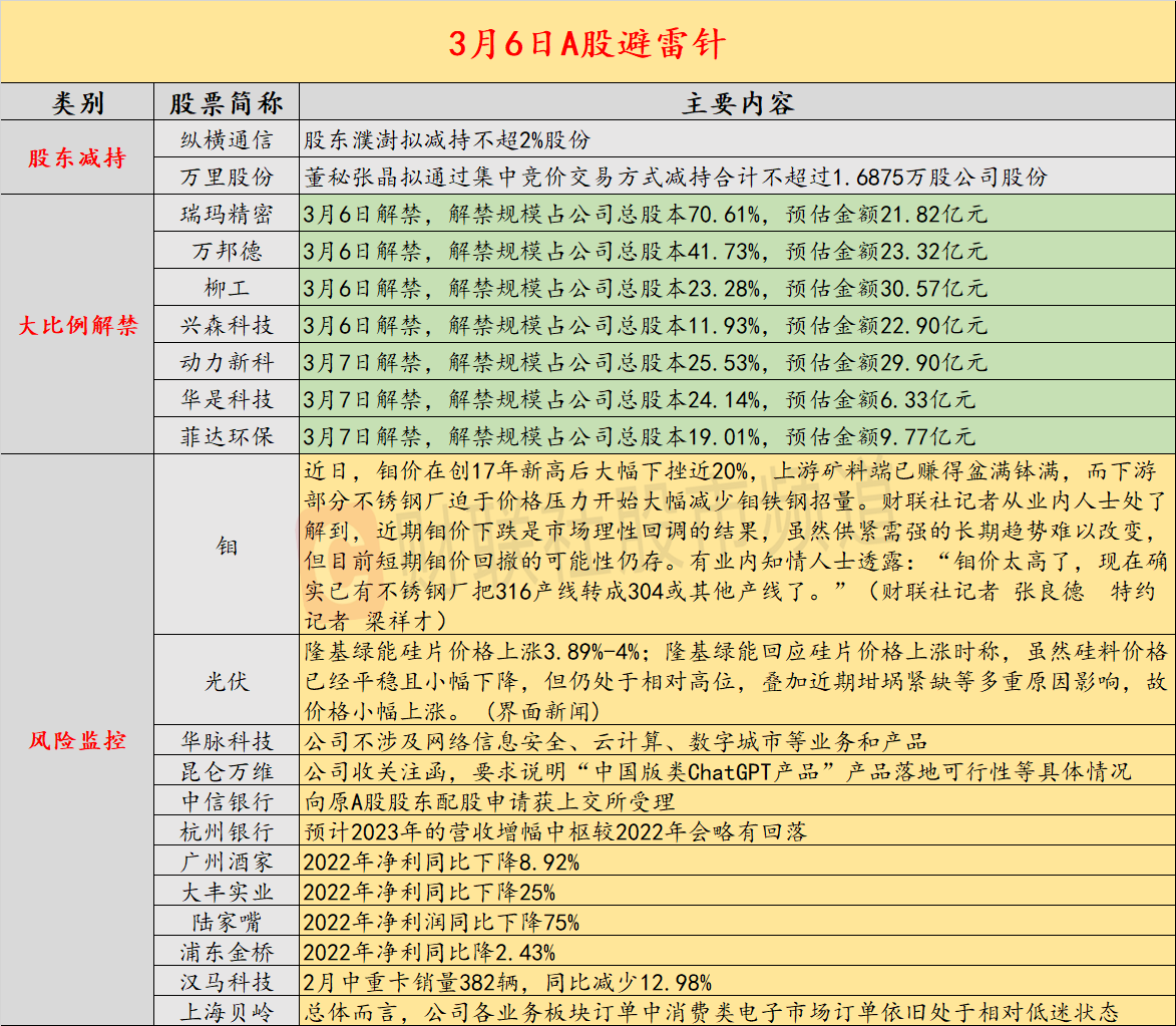 近日A股拟减持规模较之前有所减少,纵横通信股东濮澍拟减持不超2%股份;瑞玛精密、万邦德将迎来超四成以上解禁;国家发改委组织召开会议,专家建议加强铁矿石调控监管遏制价格不合理上涨;华脉科技公告,公司不涉及网络信息安全、云计算、数字城市等业务和产品;部分不锈钢厂改产线降需求,钼价创17年新高后下挫近20%;昆仑万维收关注函,要求说明“中国版类ChatGPT产品”产品落地可行性等具体情况;欧盟推迟决定是否于2035年在境内禁售内燃机汽车。