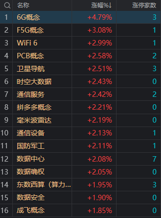财联社3月8日电,市场早盘低开后弱势震荡,三大指数均小幅下跌。指数黄白分时线明显分化,题材股相对活跃。盘面上,6G概念股逆势大涨,金信诺20CM涨停,本川智能涨超18%,三维通信、世嘉科技涨停。数据中心概念股开盘走强,南凌科技、佰维存储等涨超10%,佳力图、湘邮科技、新炬网络涨停。军工股盘中活跃,中航电测涨超8%续创新高。下跌方面,油气等周期股集体调整,中曼石油跌超5%。ChatGPT概念股盘中跳水,海天瑞声、汉王科技跌超5%。总体上个股涨多跌少,两市超2600只个股上涨。沪深两市今日成交额4447亿,较上个交易日缩量1030亿。板块方面,6G、卫星导航、数据中心、军工等板块涨幅居前,油气、养鸡、黄金、煤炭等板块跌幅居前。截至上午收盘,沪指跌0.48%,深成指跌0.39%,创业板指跌0.44%。北向资金方面,沪股通早盘净流出7.28亿,深股通早盘净流入2.72亿。