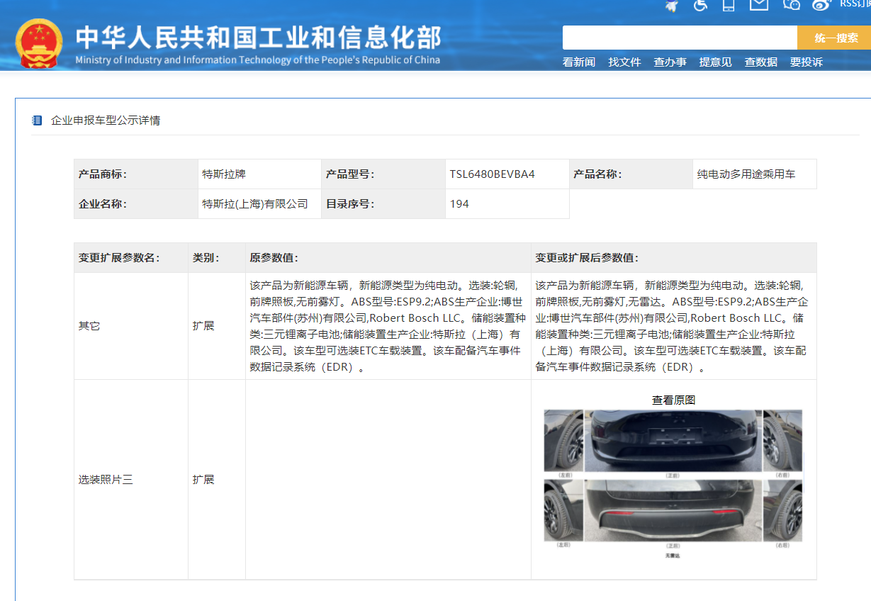 特斯拉中国产Model Y车型信息变更备案 新版车型改为“无雷达”方案