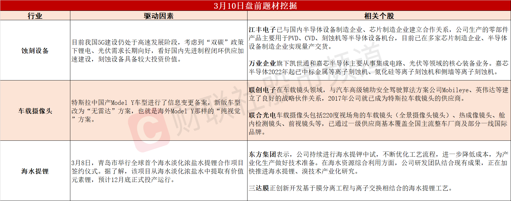 ①使用量和重要性不断上升,机构看好刻蚀设备投资价值;②国产Model Y改为“无雷达”方案,车载摄像头迎来量价齐升机遇;③全球首个海水提锂项目签约,海水淡化产业有望迎转机。