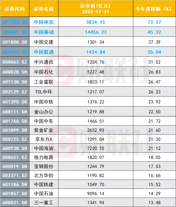 财联社3月13日电,据财联社统计,截至去年年底总市值超千亿元的上市公司中,有14家公司今年涨幅超过20%,中字头个股占据半壁江山,而涨幅最强的莫过于三大运营商的股票。千亿市值股今年涨幅居前的5只股票,三大运营商纷纷上榜,其中中国电信今年涨幅高达73%居于涨幅榜首位,中国移动涨逾45%居于次位,中国联通涨逾35%居于涨幅榜第四位。伴随着股价的大涨,三大运营商的总市值也水涨船高,今年总市值合计增超9800亿元。