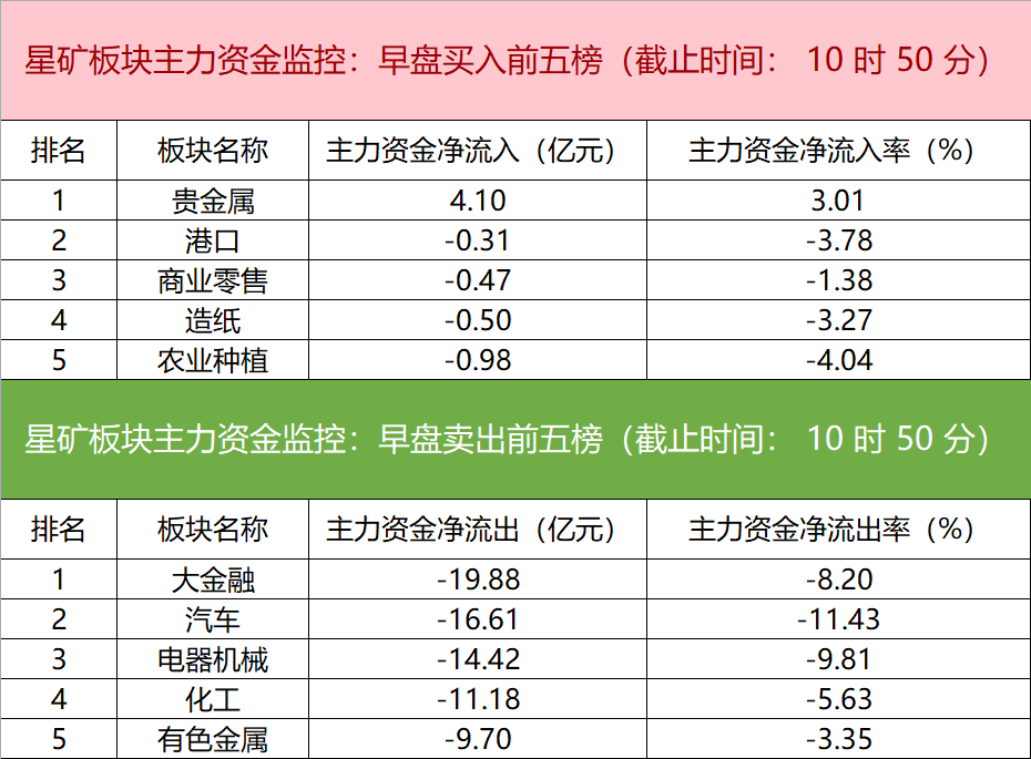 财联社3月14日电,财联社星矿数据显示,今日早盘主力资金仅净流入贵金属板块,净流出大金融、汽车、电器机械等板块,其中净流出大金融板块超19亿元。个股方面,中芯国际大涨,主力资金净买入6.47亿元,牧原股份、英飞拓、中国卫星获主力资金净流入居前;宁德时代遭净卖出超8亿元,阳光电源、比亚迪、中国软件主力资金净流出额居前。