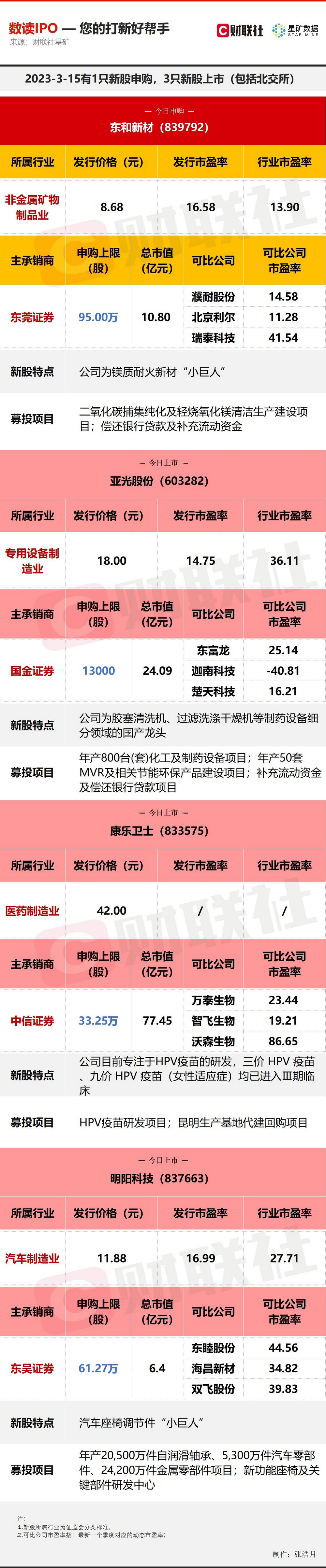 财联社3月15日电,今日1只新股申购,为北交所的东和新材;3只新股上市,分别为沪市主板的亚光股份,北交所的康乐卫士、明阳科技。