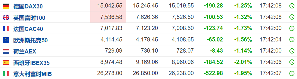 财联社3月15日电,欧股跌幅扩大,意大利富时MIB指数日内跌幅达2%。