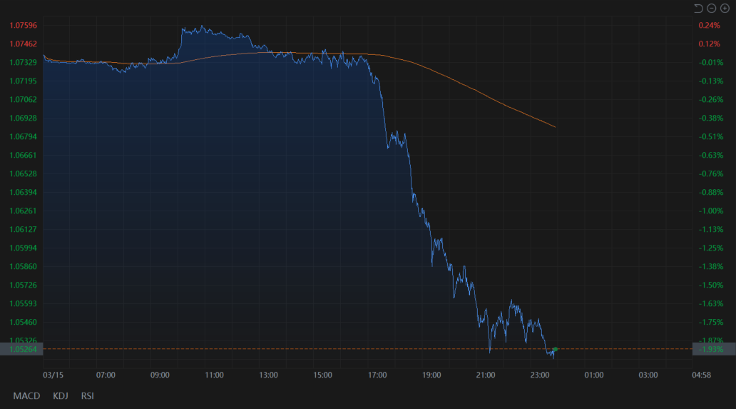 财联社3月16日电,欧元料创下三年来最大跌幅,围绕银行业的担忧促使交易员下调对周四欧洲央行升息50基点的预期。欧元兑美元周三下跌逾2%至两个月低点1.0516美元,料创下2020年3月以来的最大跌幅。避险情绪推动美元和日元上涨,银行股领跌。因交易员下调升息押注,欧元兑几乎所有G-10货币均走弱。与此同时,美国市场提高了对美联储降息的预测。