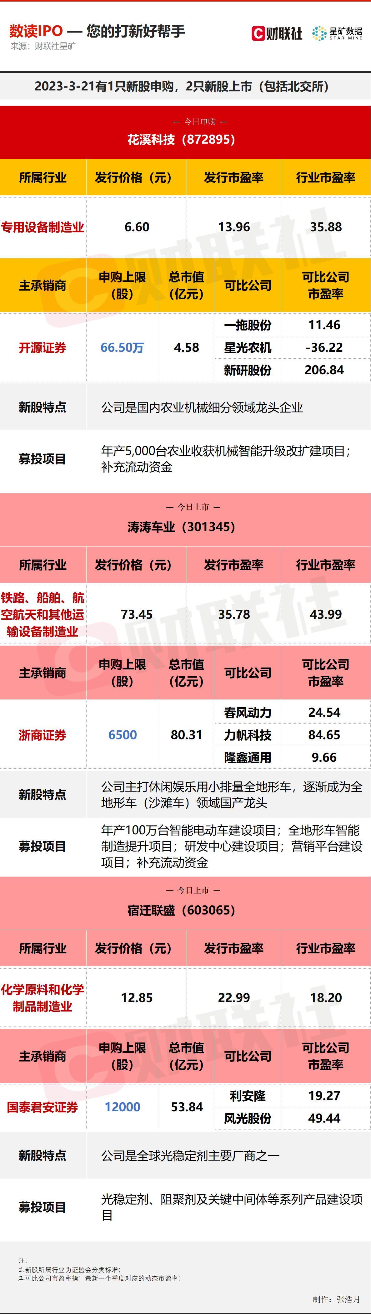 财联社3月21日电,今日1只新股申购,为北交所的花溪科技;2只新股上市,分别为创业板的涛涛车业,沪市主板的宿迁联盛。