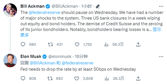 财联社3月21日电,马斯克在社交媒体上回复美国对冲基金潘兴广场资本管理公司(Pershing Square)的阿克曼(Bill Ackman)时表示,美联储周三需要至少降息50个基点。Ackman此前表示,美联储本周不应该上调基准利率,银行业危机已经造成了“金融环境明显收紧”的效果。