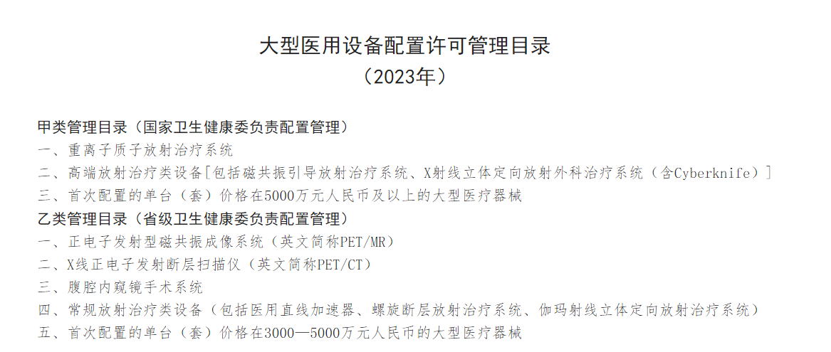 财联社3月21日电,国家卫生健康委发布大型医用设备配置许可管理目录(2023年)。与2018年版目录相比,管理品目由10个调整为6个,其中,甲类由4个调减为2个,乙类由6个调减为4个。一是正电子发射型磁共振成像系统(PET/MR)由甲类调整为乙类。二是64排及以上X线计算机断层扫描仪、1.5T及以上磁共振成像系统调出管理品目。三是将重离子放射治疗系统和质子放射治疗系统合并为重离子质子放射治疗系统。将甲类螺旋断层放射治疗系统(英文简称Tomo)HD和HDA两个型号、Edge和VersaHD等型号直线加速器和乙类直线加速器、伽玛射线立体定向放射治疗系统合并为常规放射治疗类设备。四是将磁共振引导放射治疗系统纳入甲类高端放射治疗类设备。五是规范部分设备品目名称。六是调整兜底标准。将甲类大型医用设备兜底条款设置的单台(套)价格限额由3000万元调增为5000万元人民币,乙类由1000—3000万元调增为3000—5000万元人民币。