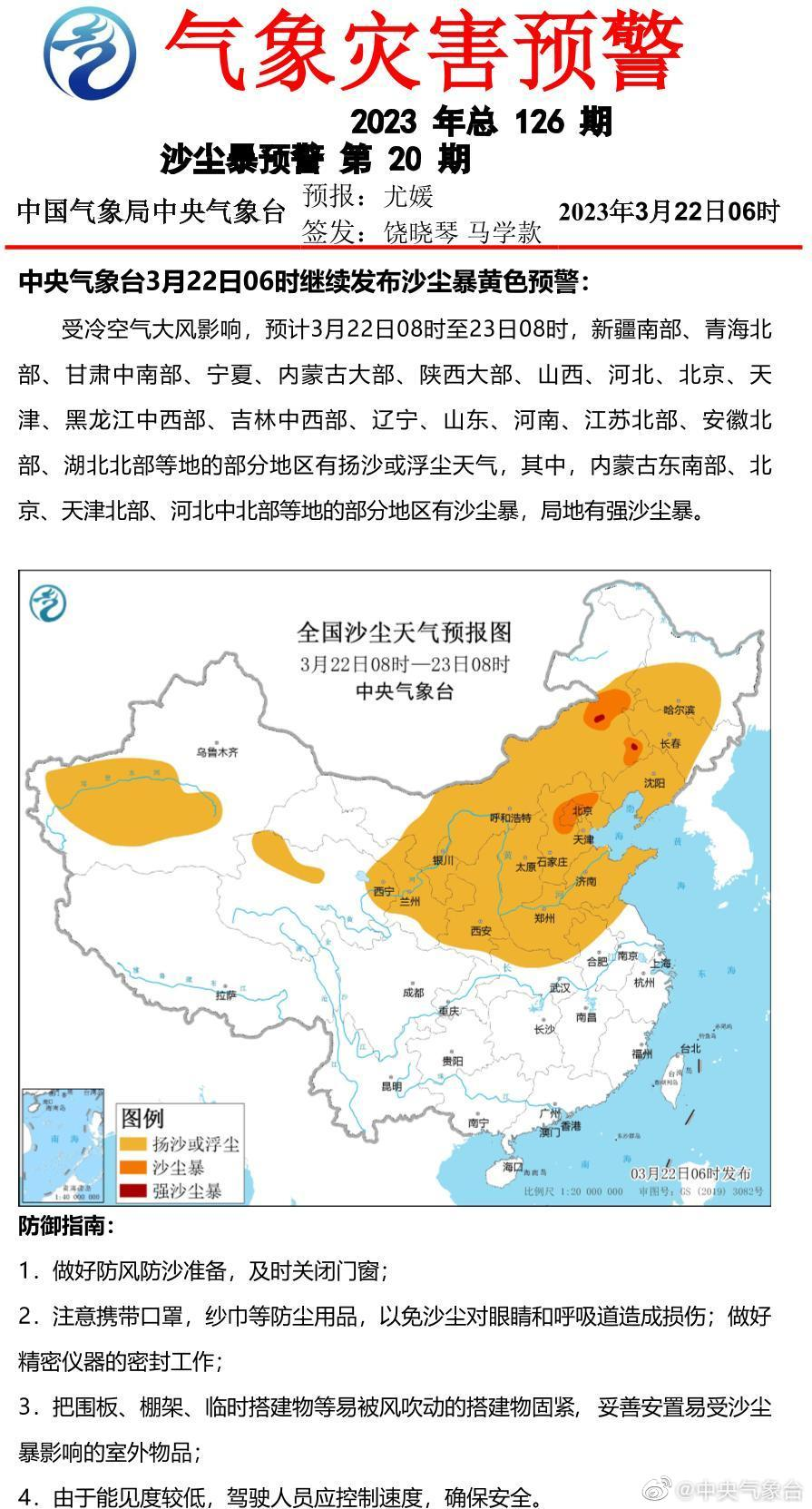 财联社3月22日电,中央气象台3月22日6时继续发布沙尘暴黄色预警:受冷空气大风影响,预计3月22日08时至23日08时,新疆南部、青海北部、甘肃中南部、宁夏、内蒙古大部、陕西大部、山西、河北、北京、天津、黑龙江中西部、吉林中西部、辽宁、山东、河南、江苏北部、安徽北部、湖北北部等地的部分地区有扬沙或浮尘天气,其中,内蒙古东南部、北京、天津北部、河北中北部等地的部分地区有沙尘暴,局地有强沙尘暴。